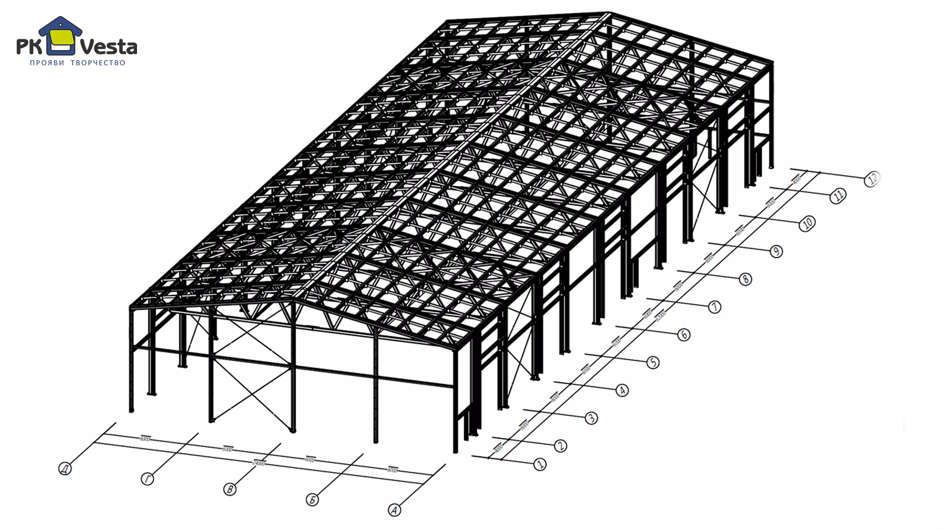 - 100% protection of the frame from corrosion unlike a frame made of black metal, where primer (GF-021) is used, or at best primer + enamel (1 or 2 layers up to 100 microns) All the main elements of the frame are galvanized (columns, trusses and purlins)