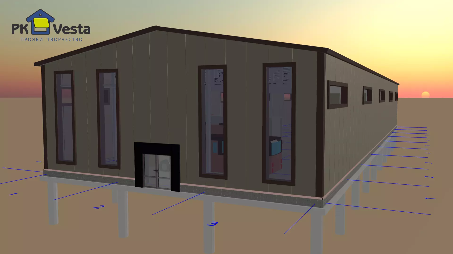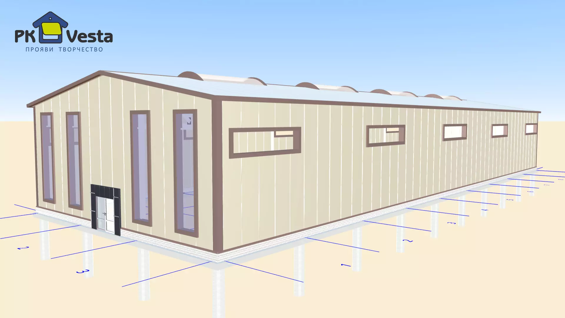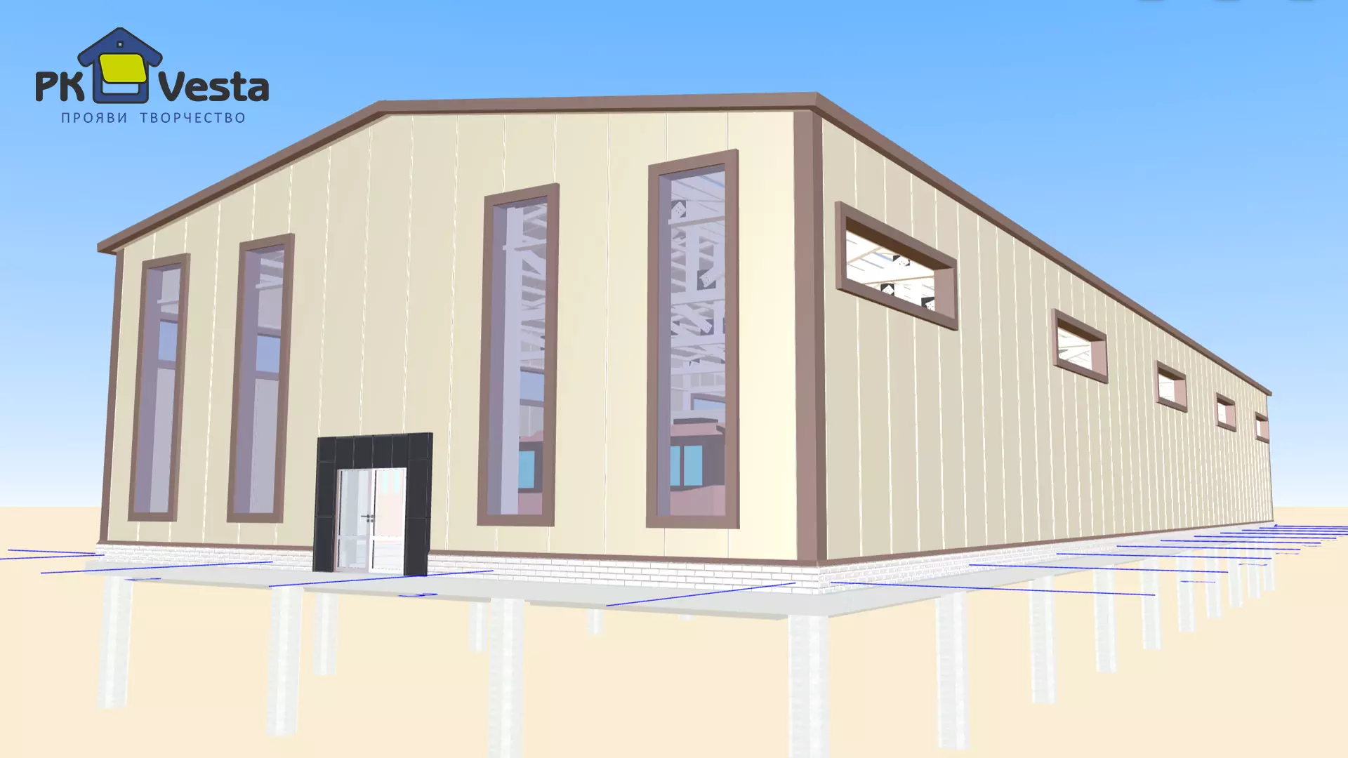 The lightweight steel frame is covered with non-combustible sandwich panels (walls - 60 mm and roof 80 mm)
